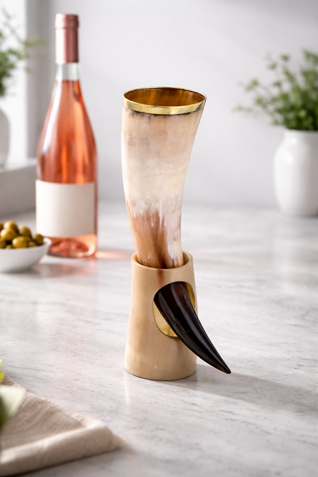 Adaugă un element autentic și elegant meselor tale cu acest pahar premium din corn de bivol natural cu suport și finisaj auriu, realizat manual pentru a îmbina frumusețea naturii cu un design rafinat.