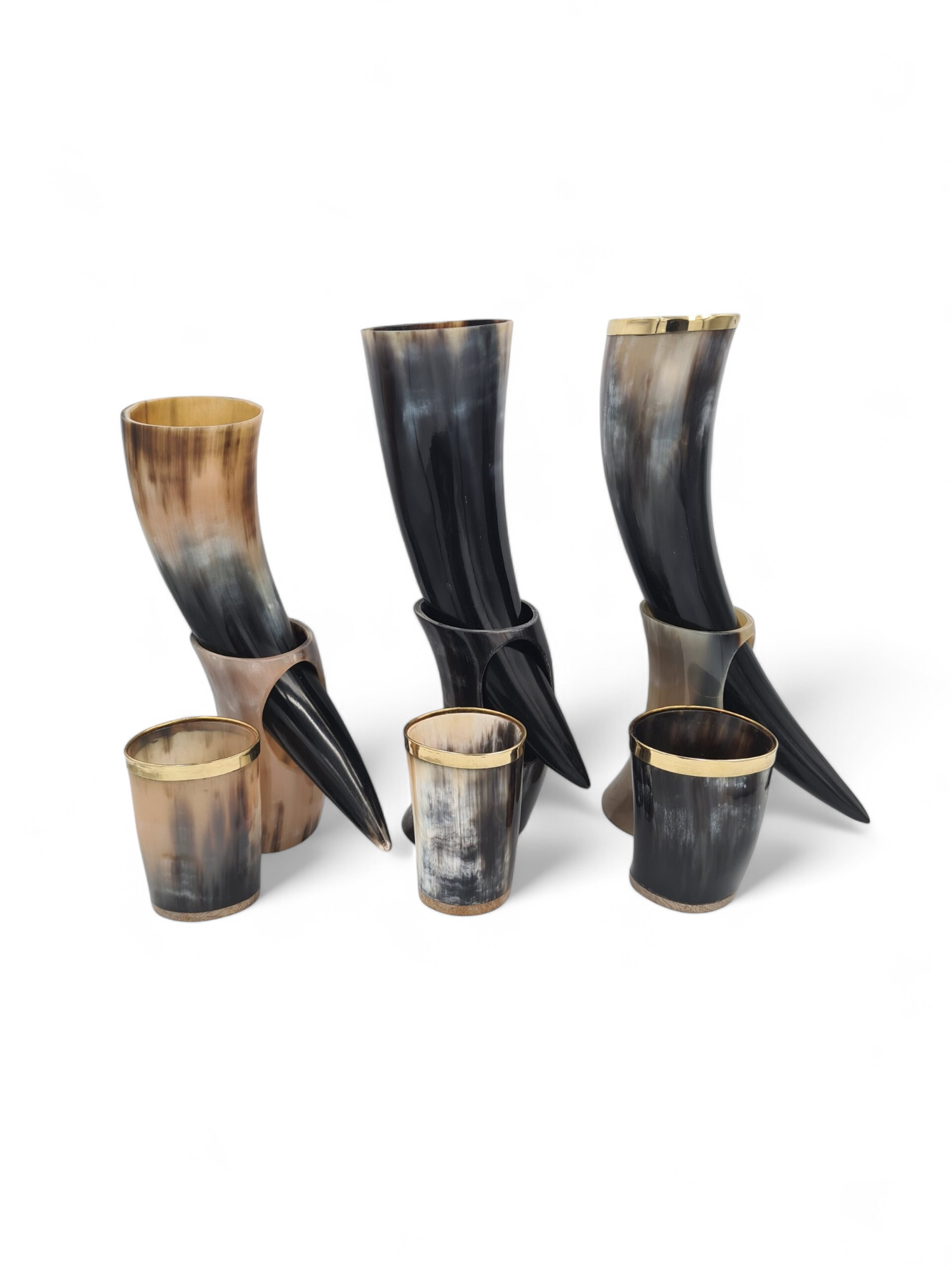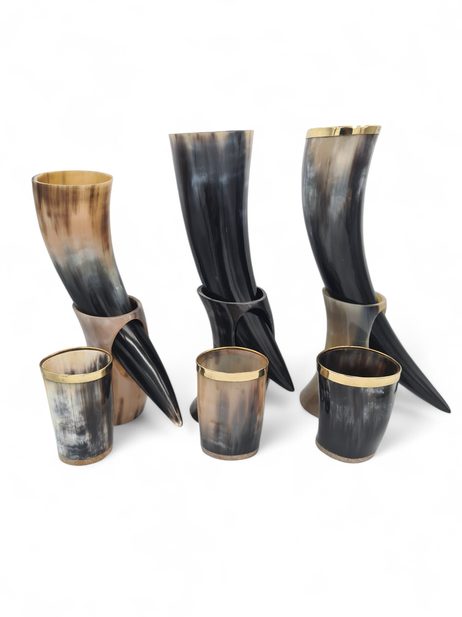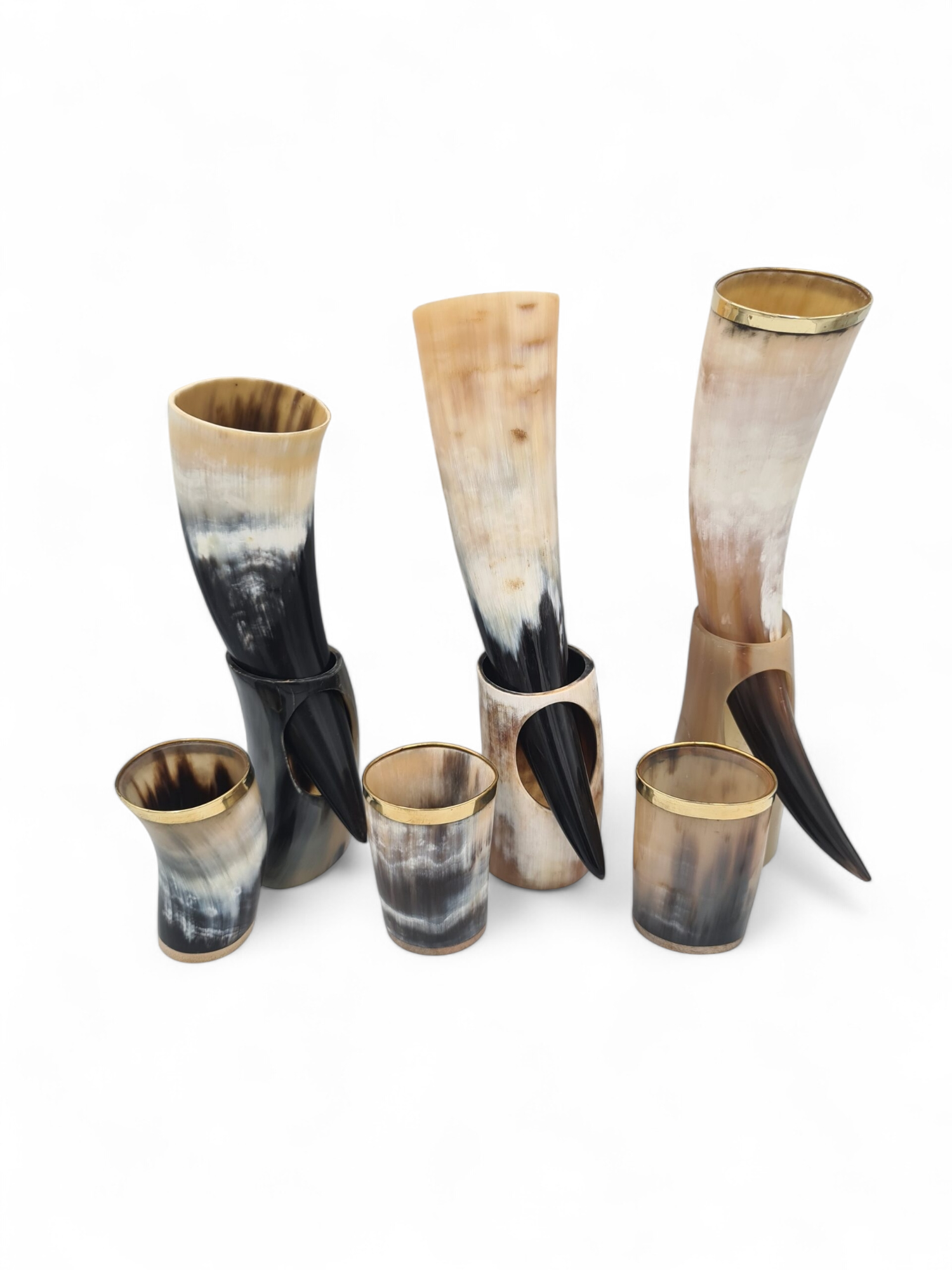 Set de 3 pahare si 3 pahare de tip corn de bivol