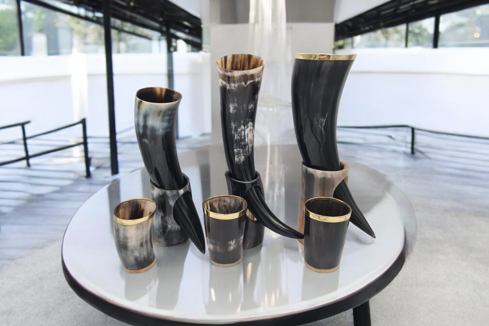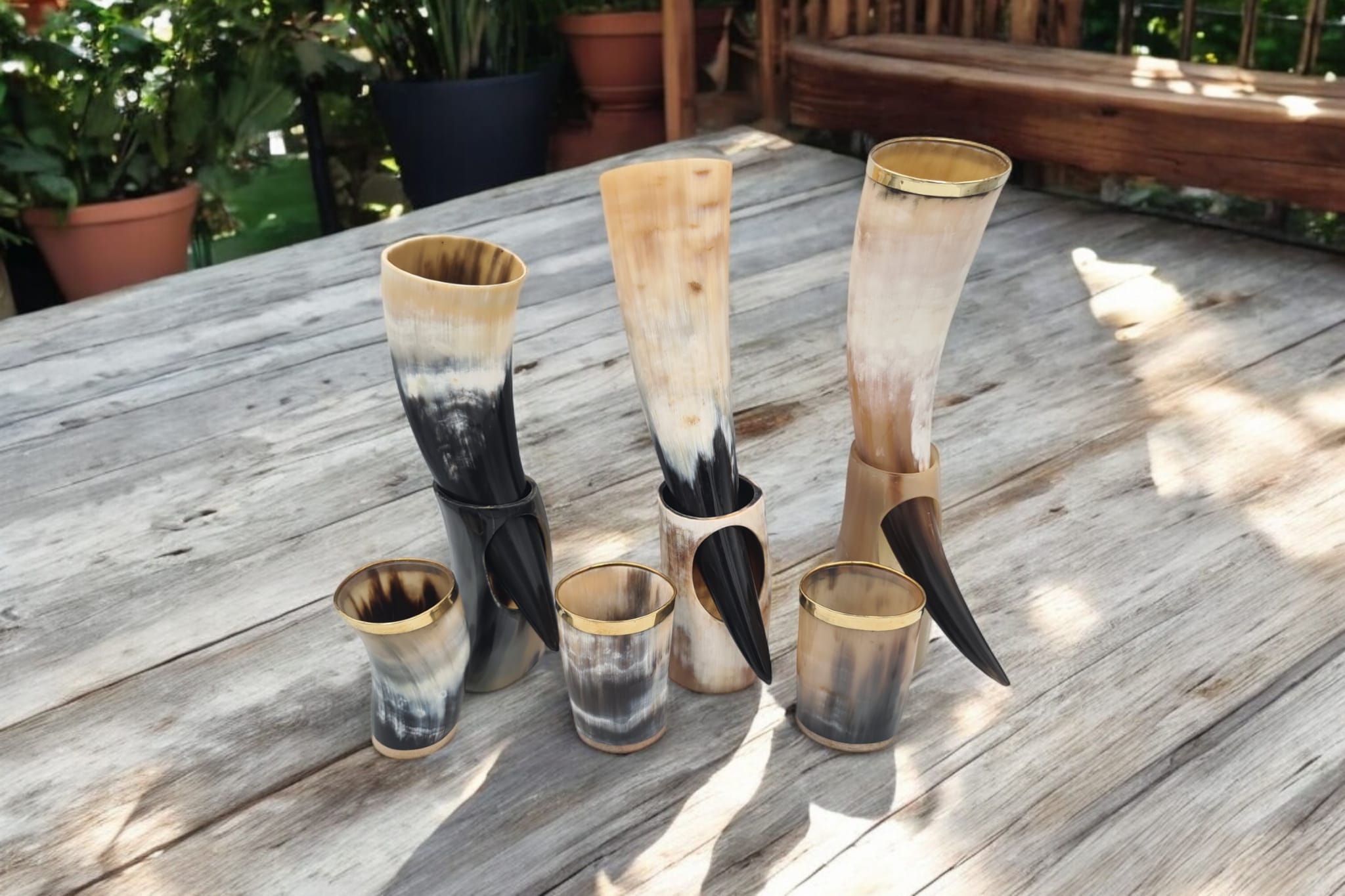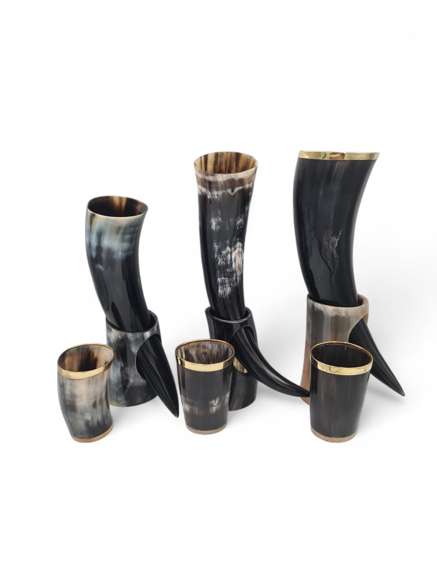 Set de 3 pahare si 3 pahare de tip corn de bivol